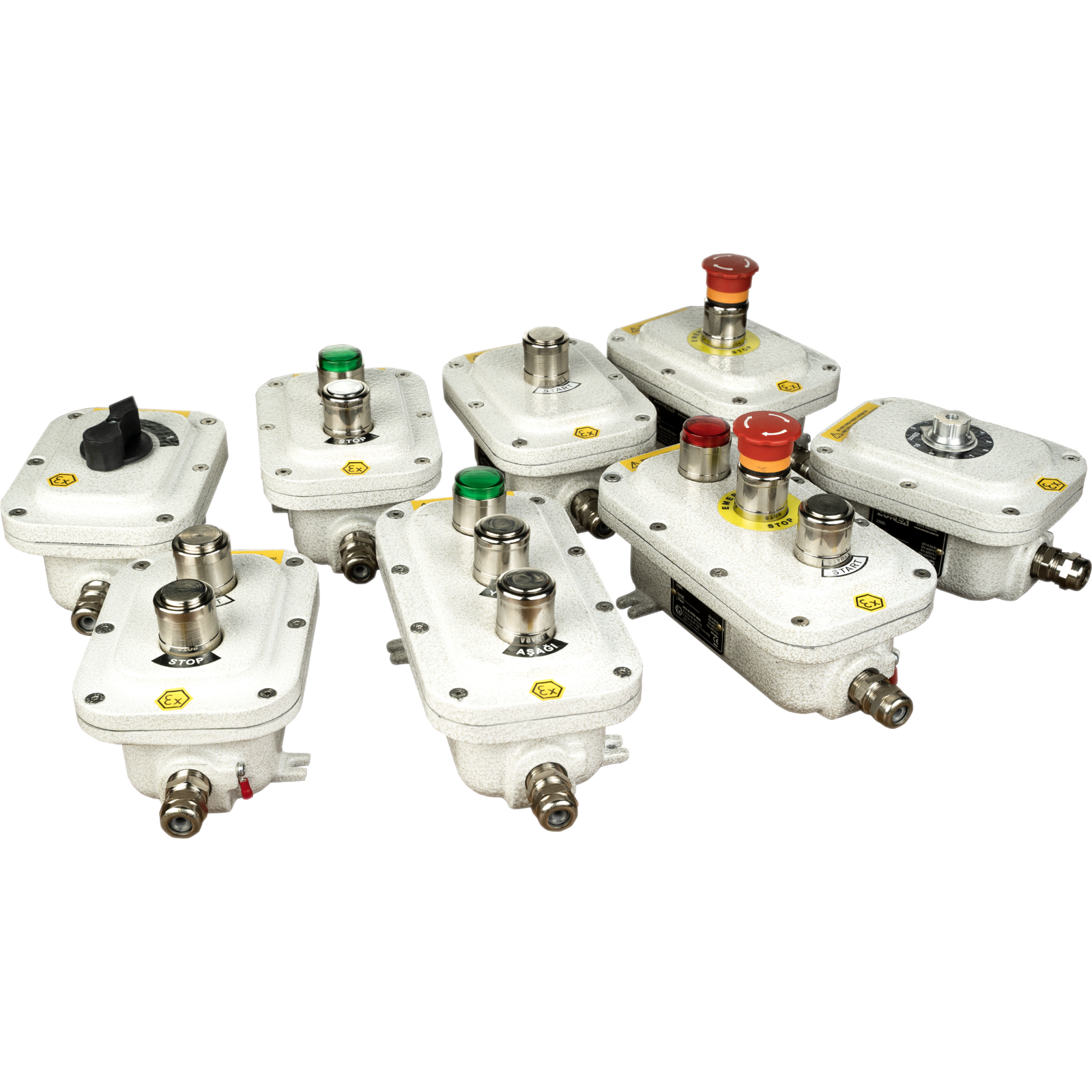 📌 Start–Stop, acil stop ve sinyal lambası kombinasyonlu hazır exproof kontrol üniteleri.